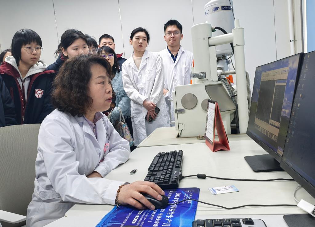 在分析测试中心一楼大型仪器共享服务平台,学生们探秘“科研重器”,见证化学力量。中心主任刘治刚带领学生们参观了透射电子显微镜、600M核磁共振波谱仪、液相色谱-质谱联用仪、扫描电子显微镜等大型仪器设备,为学生们深入讲解了各类大型仪器在化学结构解析、材料检测及表面分析中的应用原理,中心负责大型仪器的教师为同学们做了演示实验。